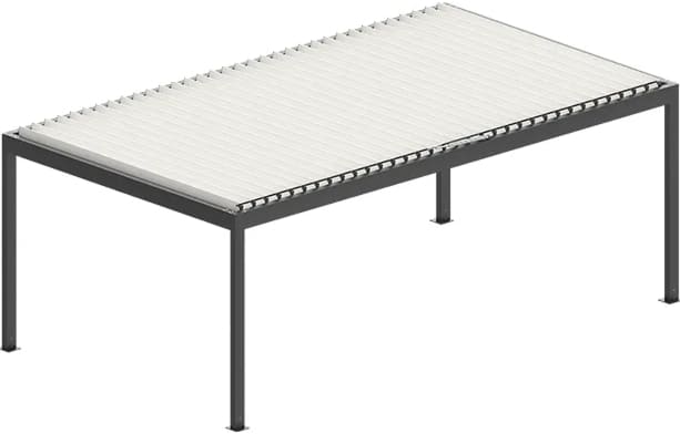 Pergola SB400 łączy w sobie trwałość i solidność konstrukcji wykonanej z ekstrudowanego aluminium i stali nierdzewnej z wysoką funkcjonalnością prostopadłej osłony dachowej składającej się z ruchomych, sterowanych automatycznie piór.